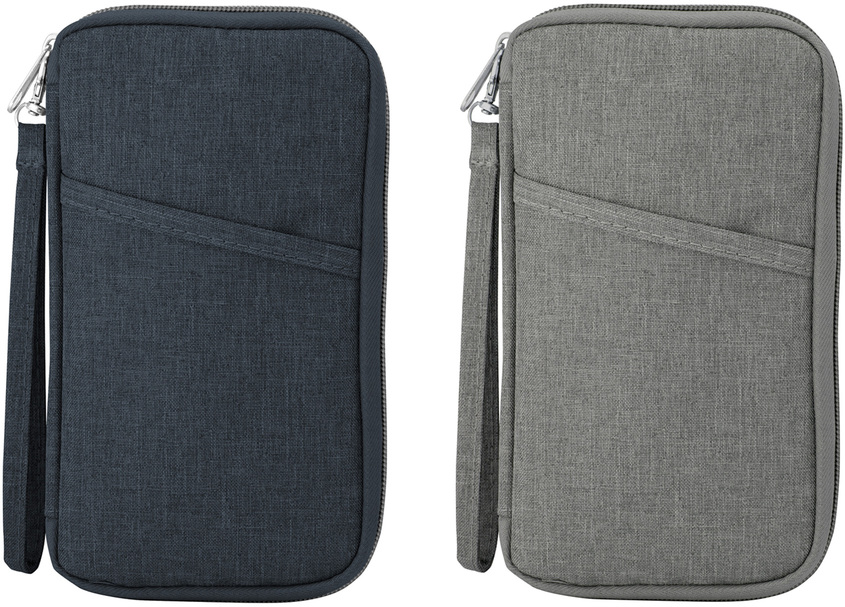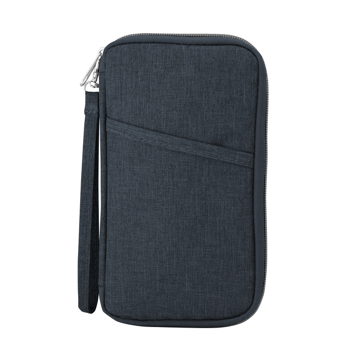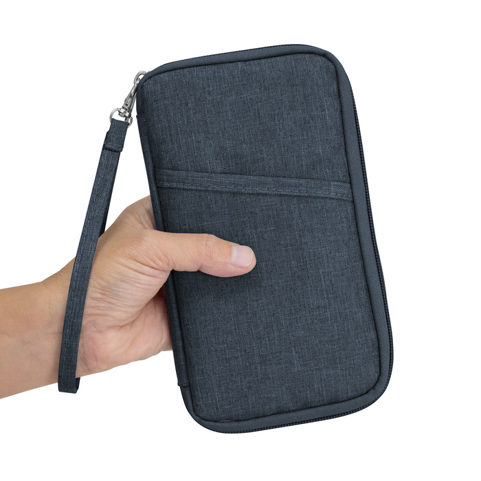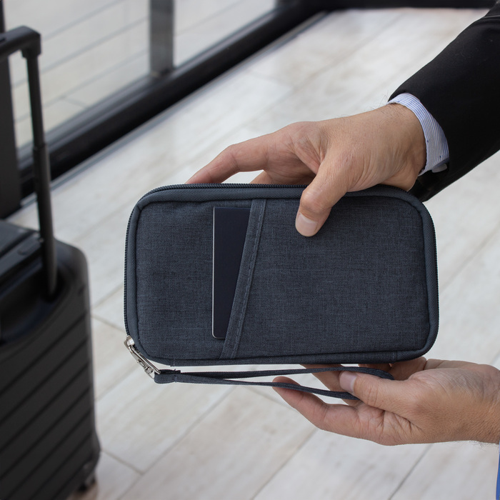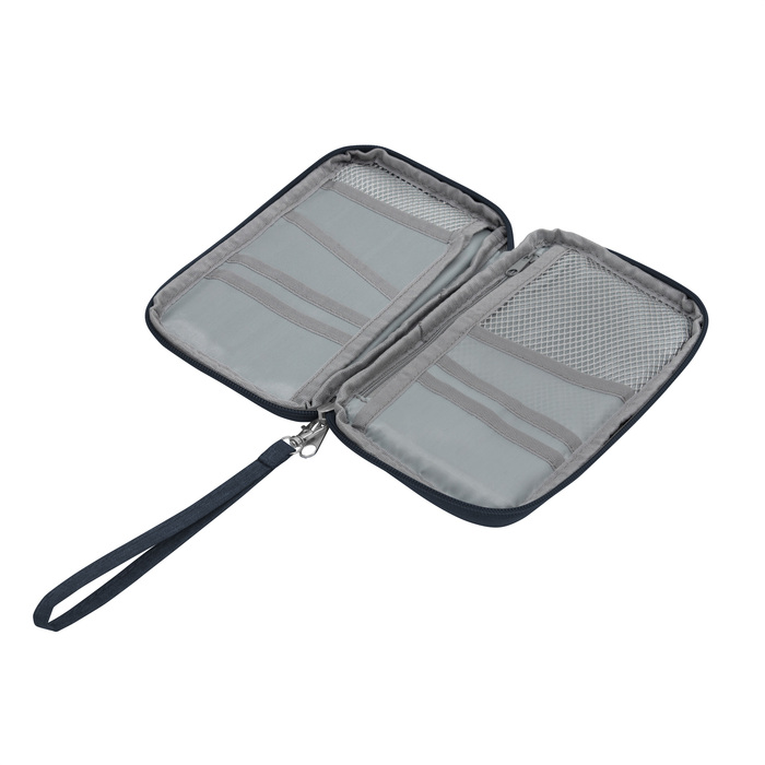 Billetera portadocumentos. Estructura acolchada con cierre perimetral y un bolsillo al frente. Bolsillos internos de red de ambos lados con múltiples espacios organizadores y un bolsillo con cierre. Correa de poliéster desmontable con mosquetón. Tirador de cierre metálico.