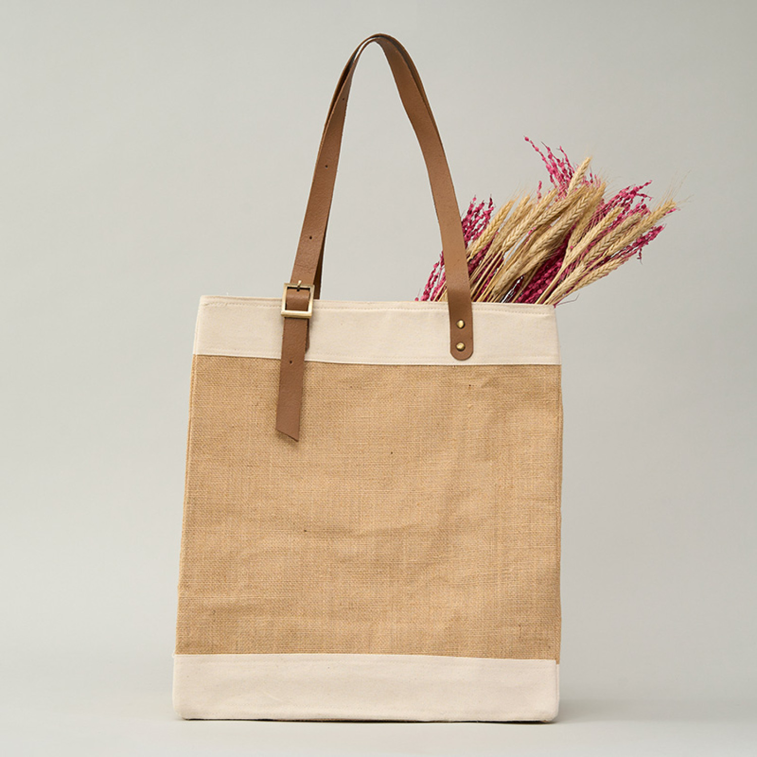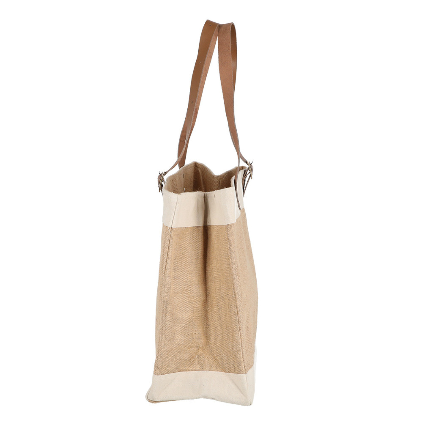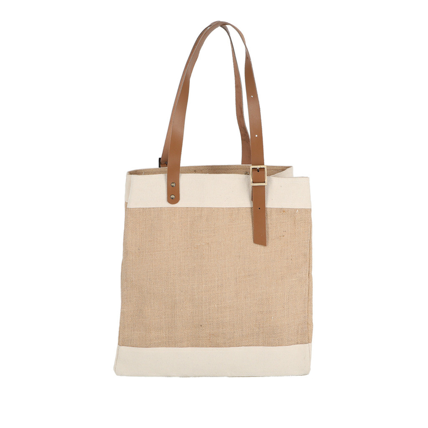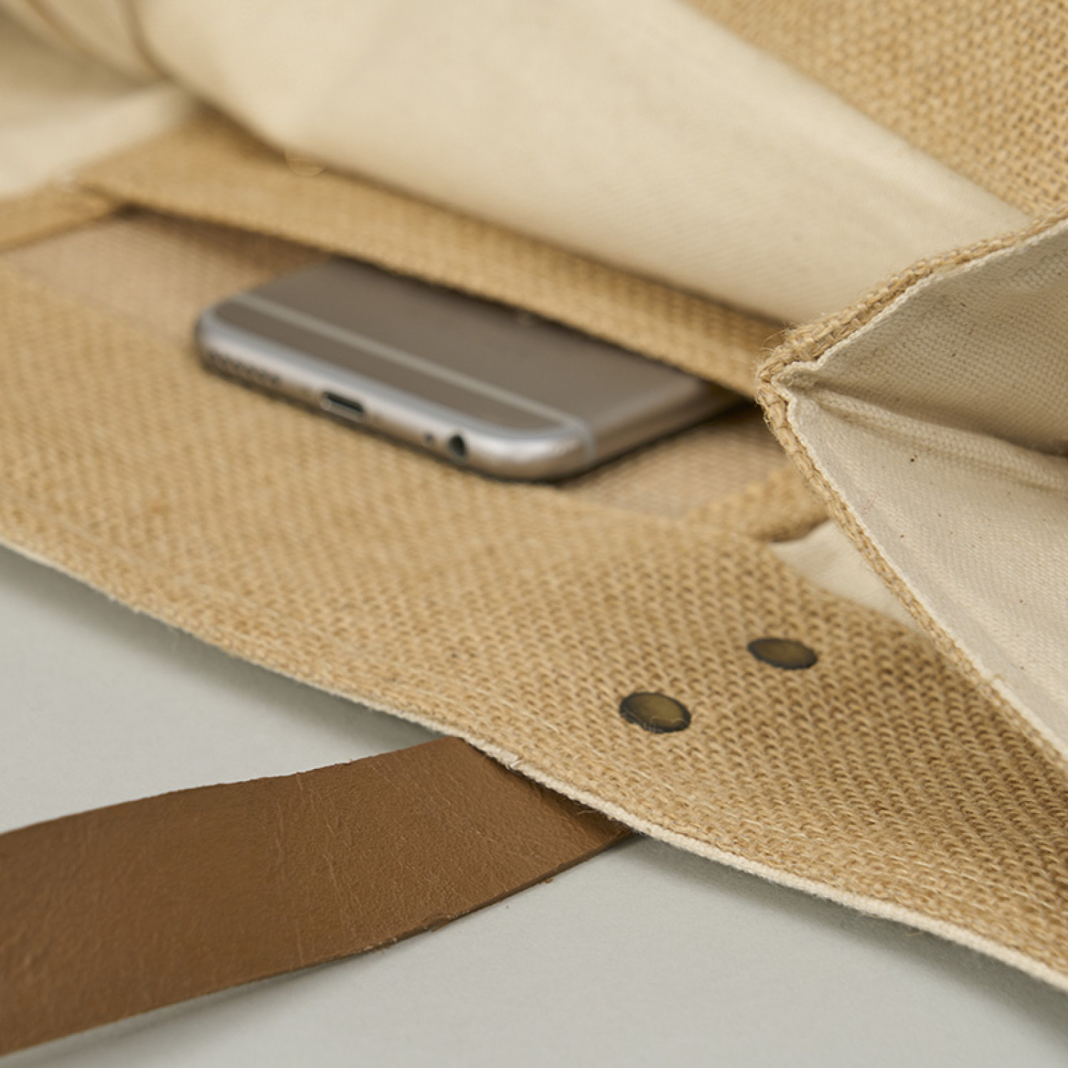 Bolsa de uso personal color natural. Hecha con fibras de yute y algodón, cuenta con correas de cuero con hebilla para regular el largo, además de un práctico bolsillo interior.