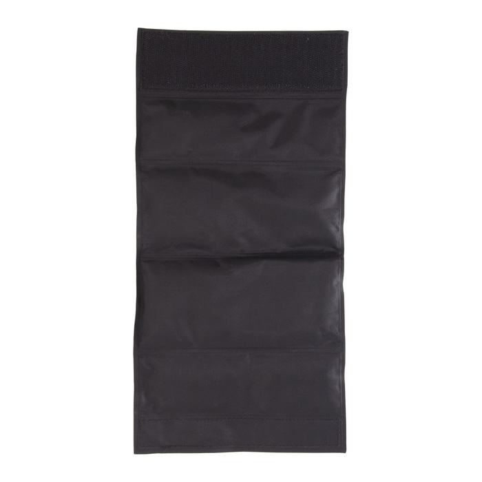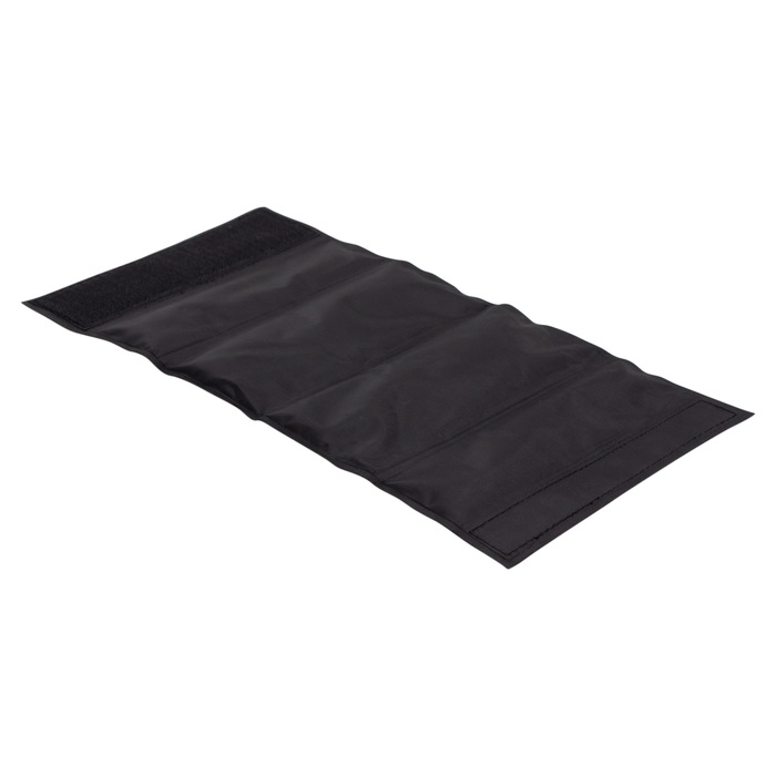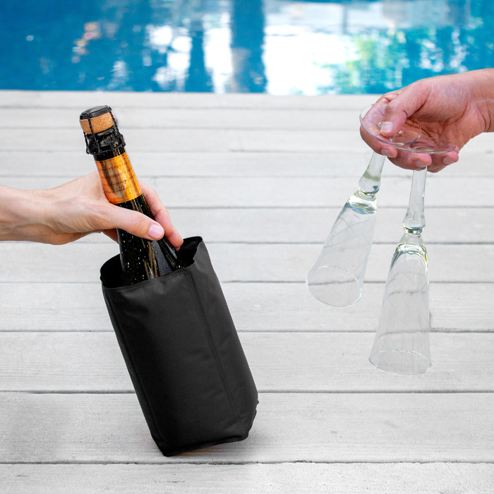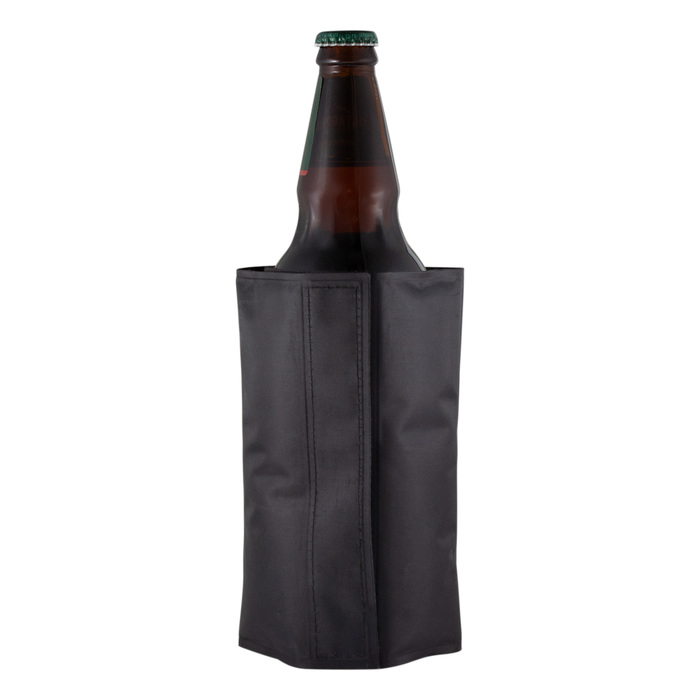 Poliéster + PVC + gel enfriante. Peso 270 g. Cooler/enfriador de Botellas. Interior con relleno de gel. Cierre de velcro.