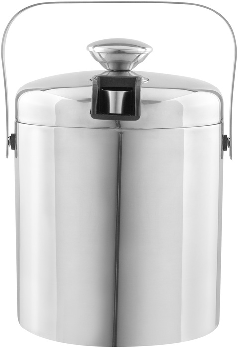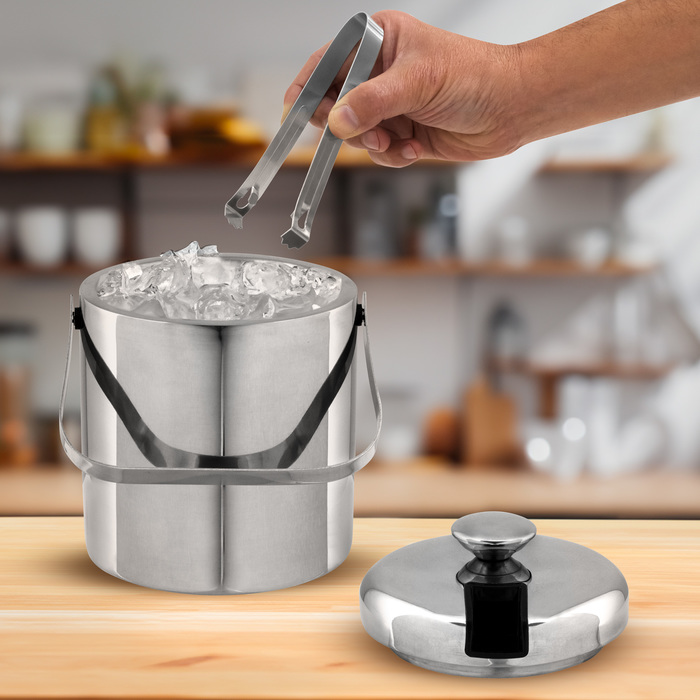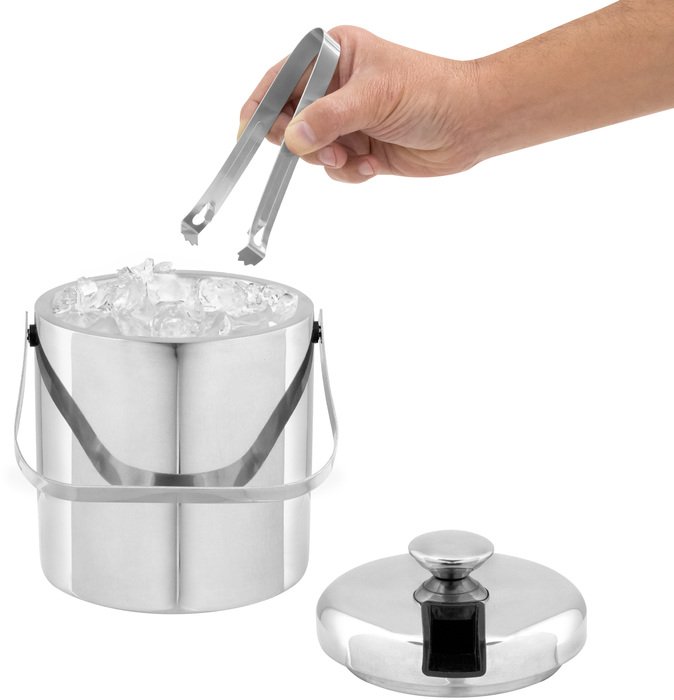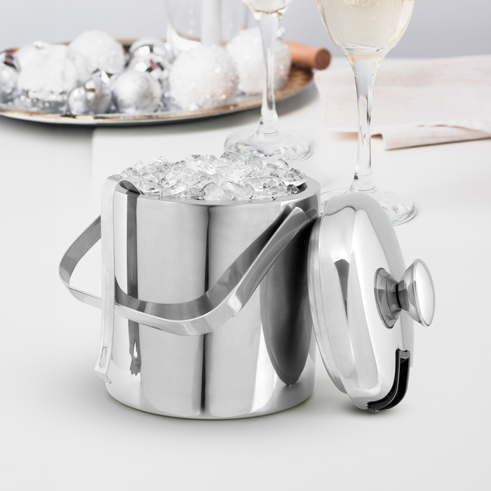 Medidas 14 x 14 cm. Capacidad 1100 ml. Acero inoxidable. Interior en acero 304 y exterior en acero 201. Hielera de mesa con tapa. Pinza para hielo de acero inoxidable, encastrable en la misma tapa. Asa de acero inoxidable para transportar. Presentación en caja de regalo kraft.