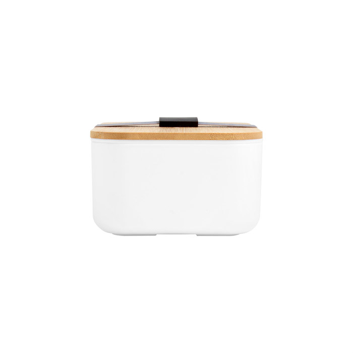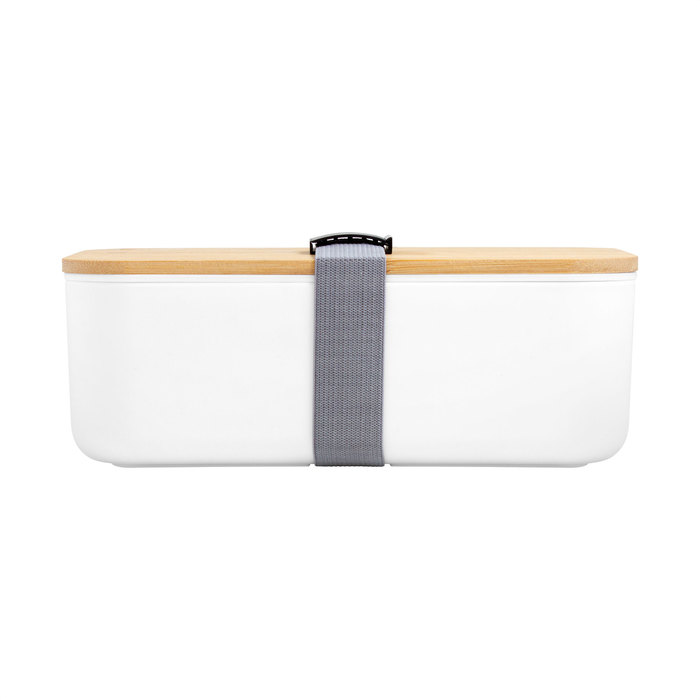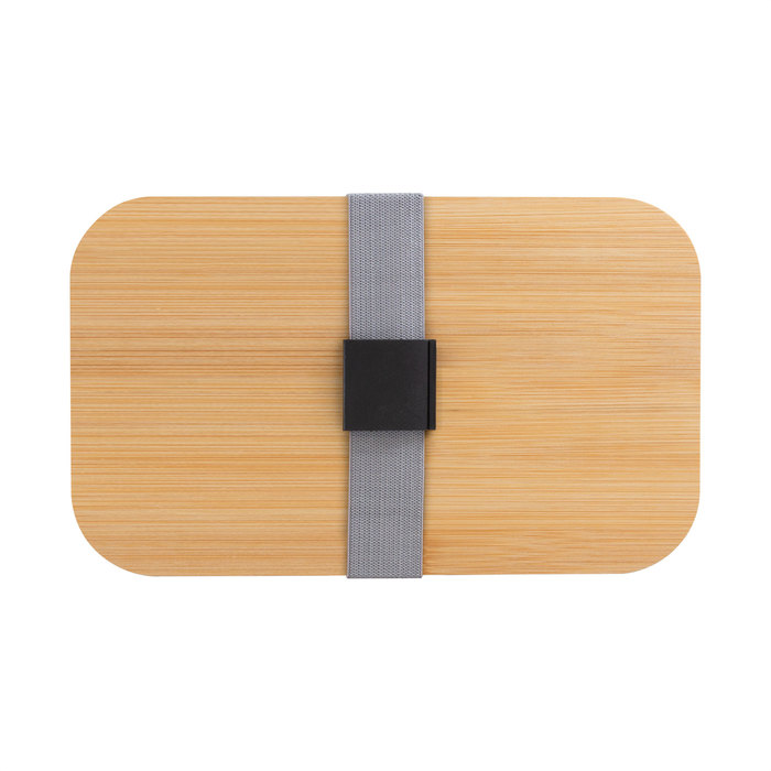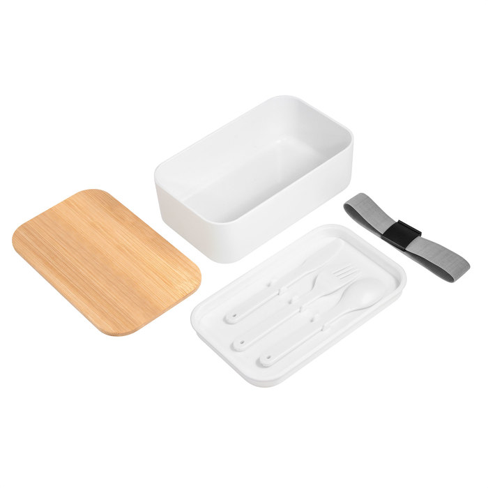 Contenedor de alimentos con tapa de Bambú. Posee un compartimento plástico y bandeja porta set de 3 cubiertos (cuchillo, tenedor y cuchara). La tapa de bambú debe presionar firmemente la bandeja donde se fija el juego de cubiertos. Cierre con sujeción elástica color gris y hebilla plástica color negro. Producto apto para microondas (sin la tapa). Importante: solo se puede calentar la comida, NO sirve para cocinarla.