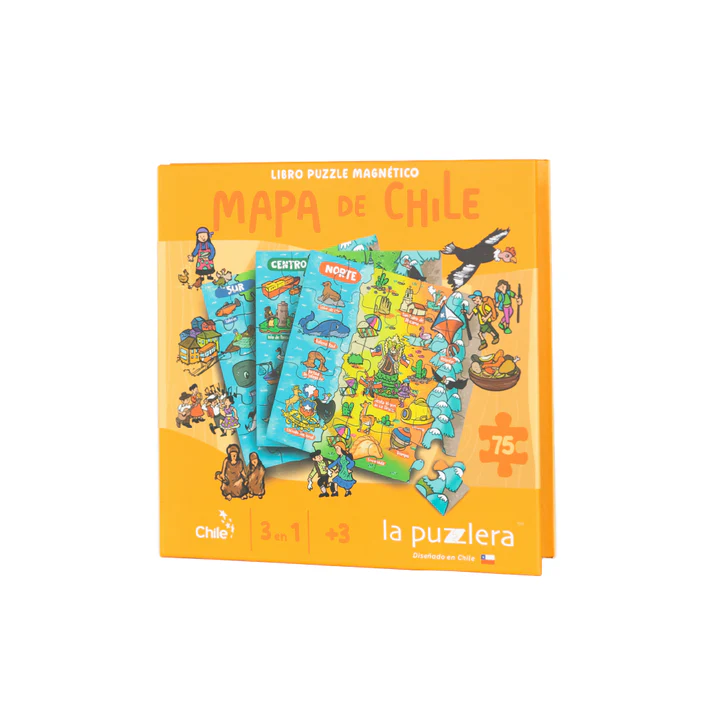 Divertido y educativo puzzle magnético que invita a niños y niñas a descubrir Chile de norte a sur mientras aprenden jugando. Incluye 75 piezas magnéticas con ilustraciones coloridas que representan regiones, paisajes, flora, fauna y elementos culturales del país, para reforzar el aprendizaje temprano.