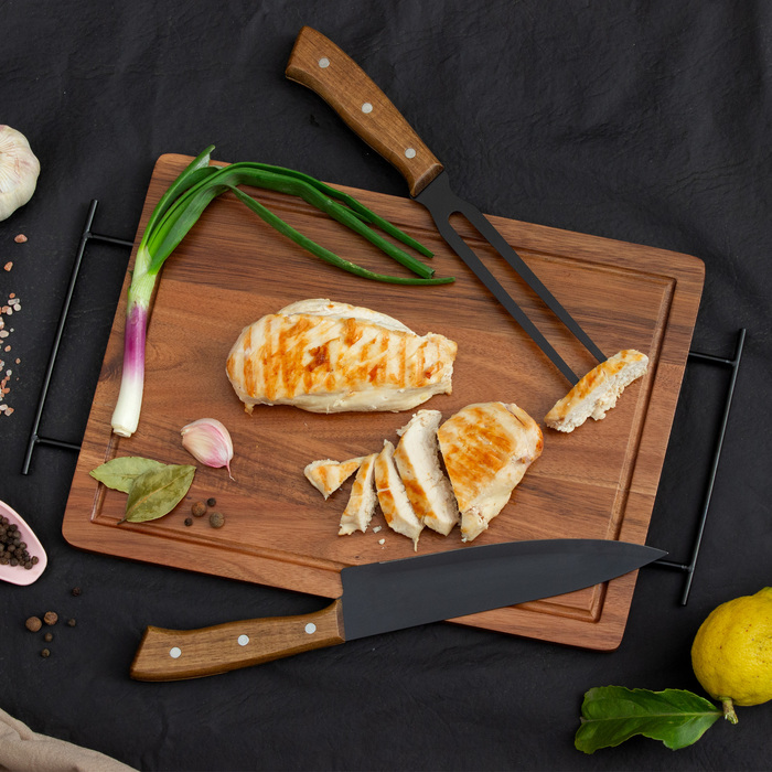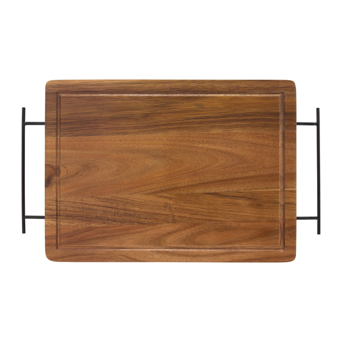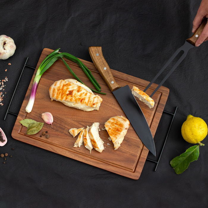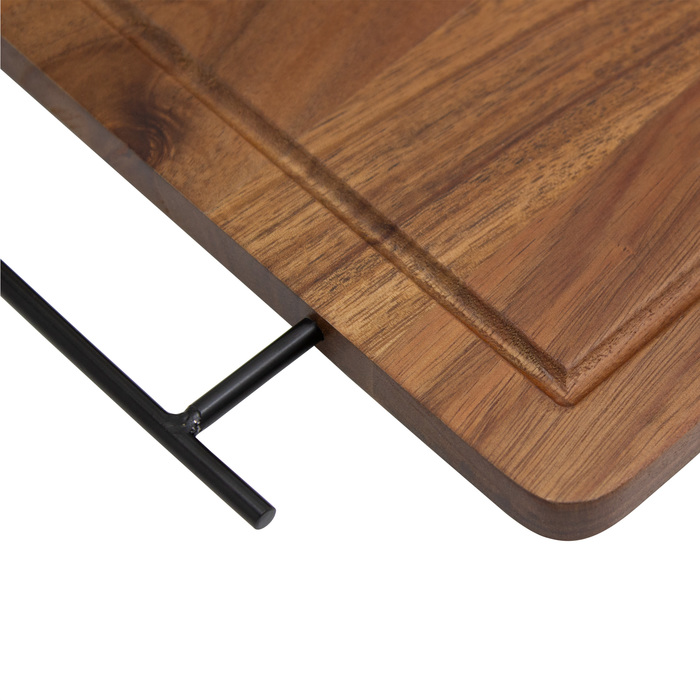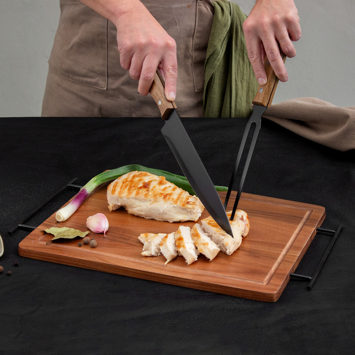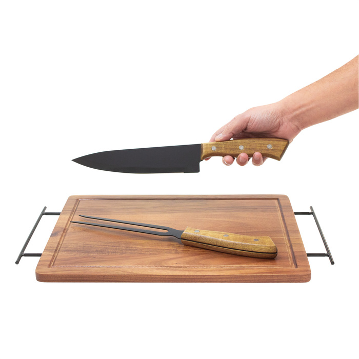 Medidas 43 x 26 x 1,2 cm. Madera y acero inoxidable. Set de asado. Tabla de corte / Bandeja de madera de acacia con asa de ambos lados de acero de carbono. Contiene 2 utensilios de acero inoxidable 420 y mangos de madera de acacia: Cuchillo de 33,5 cm y 150 g, y Tenedor de 31,5 cm y 115 g. Cada utensilio y el set completo se presentan en caja de regalo kraft.