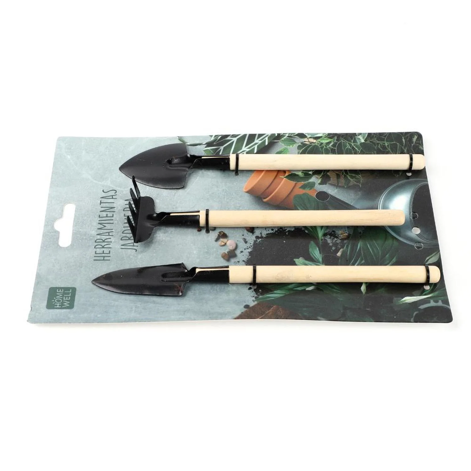 Kit de 3 herramientas de jardinería con mango de madera: pala ancha, pala angosta y rastrillo. Ideales para el trasplante, aireación y cuidado de macetas y plantas de interior. Resistentes y cómodas. Un regalo perfecto para amantes de la naturaleza.